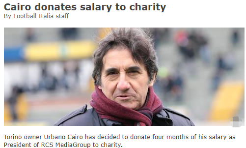 都灵老板捐款50万欧元,用于抗击疫情 2020年04月30日 08:05 新浪网 作者 肆客足球App 4月30日消息,意甲都灵俱乐部老板乌尔巴诺-凯罗决定捐出自己担任RCS媒体集团总裁的四个月薪水,用于抗击疫情。 RCS发布一份声明证实,凯罗放弃了自己四个月的薪水,大约相当于50万欧元,这笔钱将捐给意大利相关的额抗疫部门。 登录/注册后可看大图
