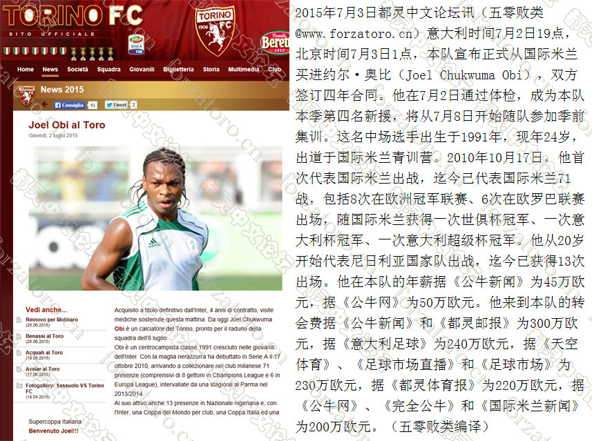 都灵宣布新赛季第四笔引援 Joel Chukwuma Obi 约尔·奥比 |